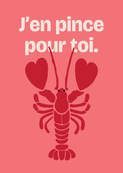 « J’en pince pour toi » : Un homard rouge vif, pinces en coeur ;