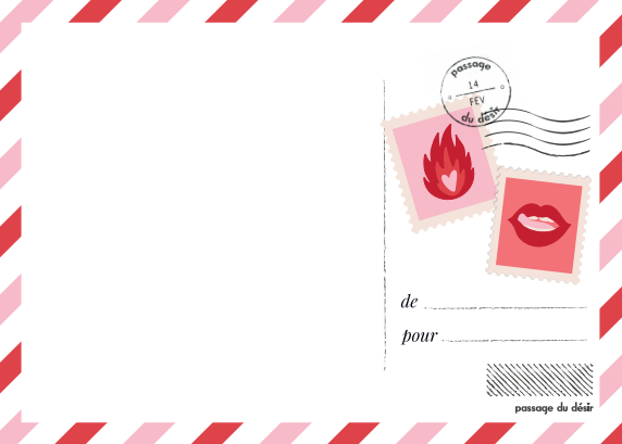 Pour cette opération, Passage du Désir a créé une collection de cartes postales originales, à mi- chemin entre tendresse et impertinence. Chaque visuel, pensé pour refléter la diversité des couples et des façons d’aimer, joue sur les mots et les doubles sens chers à l’enseigne :